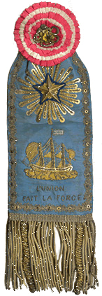 « Il est proposé et secondé que l'insigne qui se portera à la boutonnière aux jours de fête, sera une bandelette de soie bleue sur laquelle sera frappée une étoile entourée de rayons. Au-dessous, un vaisseau voguant à pleines voiles avec le mot Acadie écrit sur son pavillon. La devise au bas sera: « L'union fait la force ». Le tout couronné d'une rosette en ruban rouge et blanc. »